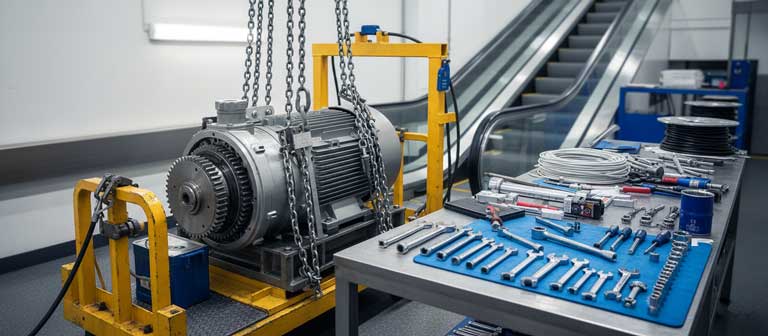 تعمیرات اساسی پله برقی معمولاً شامل جابجایی قطعاتی با وزن بالا مانند موتور، گیربکس یا بخشهایی از زنجیر پله است. در این فرآیند، ایمنی تعمیرات پله برقی مستلزم رعایت دقیق اصول لیفتینگ (Lifting) و جابجایی بار است. استفاده از تجهیزات مناسب مانند جک، زنجیرهای مخصوص و تجهیزات بالابری استاندارد، حیاتی است. همچنین، اطمینان از قرارگیری صحیح و پایدار قطعات حین تعمیر، از سقوط ناگهانی آنها و آسیب به تکنسین پله برقی یا تجهیزات جلوگیری میکند. هرگونه حرکت یا جابجایی باید هماهنگ و با نظارت مستقیم سرپرست تیم انجام گیرد.