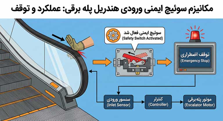 میکروسوئیچ ورودی هندریل پله برقی چطور از حوادث جلوگیری میکند؟ بررسی تخصصی عملکرد، مدار سری ایمنی، استاندارد EN115 و راهنمای عیبیابی برای تکنسینها.