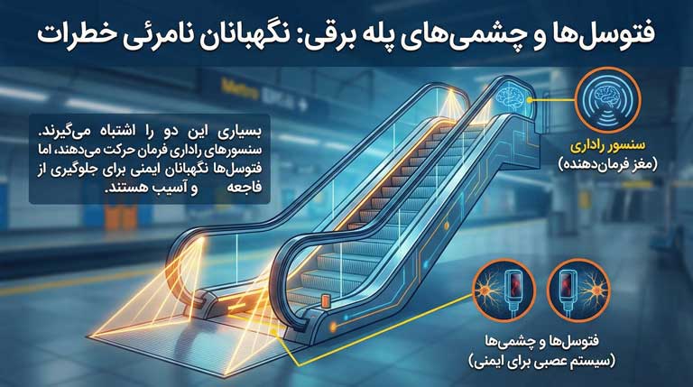 بسیاری از کارفرمایان و - این دو قطعه را با هم اشتباه میگیرند و فکر میکنند سنسور راداریِ بالای پله برقی همان کاری را میکند که چشمیهای پایین دستگاه انجام میدهند. این یک اشتباه فنی و البته مهلک است. اگر سنسورهای تشخیص مسافر را «مغزِ فرماندهنده» برای حرکت بدانیم، فتوسلها (Photocells) و چشمیهای نوری، «سیستم عصبی» پله برقی برای فرار از فاجعه و آسیب هستند.