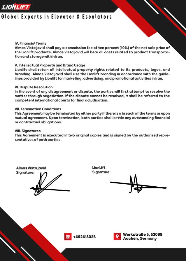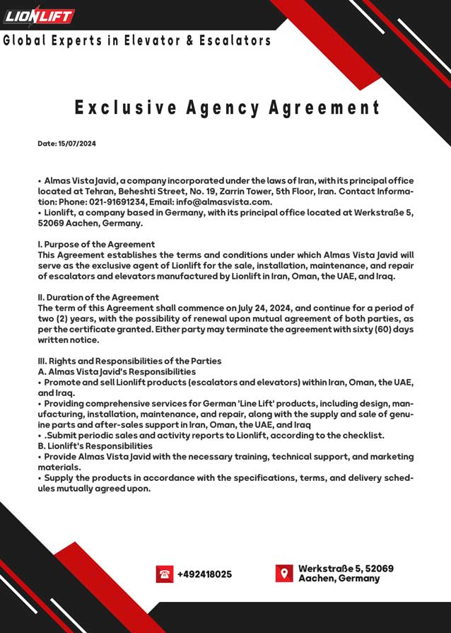 همکاری میان شرکت الماس ویستا جاوید و لاین لیفت آلمان، نویدبخش آیندهای روشن برای صنعت پله برقی ایران است. با ادامه این همکاری، انتظار میرود که پروژههای بیشتری با کیفیت عالی و در زمانبندی دقیق در داخل و خارج از کشور به انجام برسد.